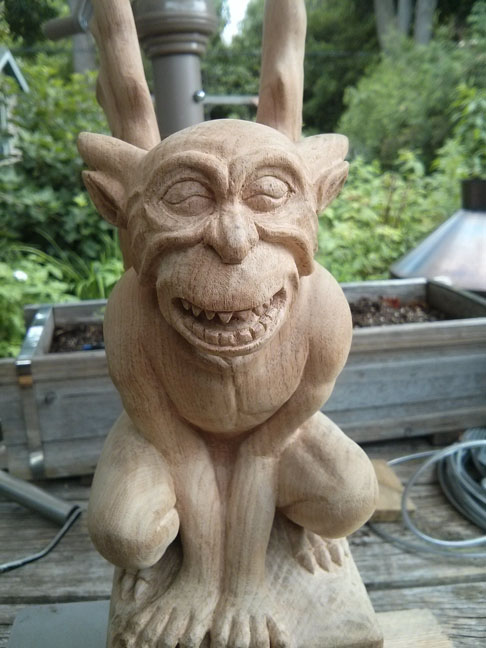 Hope fellow Canadians had a great day off. I enjoyed quality time carving in the garden, and as a result, Trefour’s face is done. Here he is, in all his happy glory.